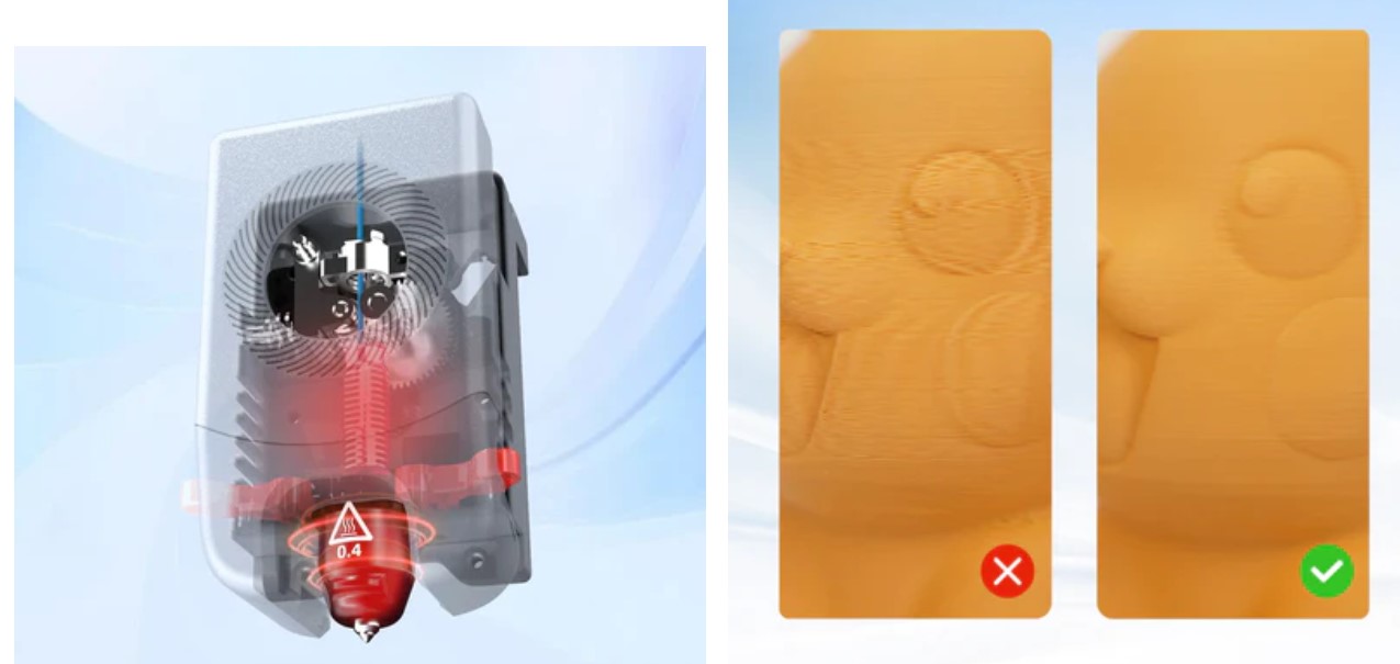 Gracias a su diseño con motor conectado directamente al extrusor, el extrusor de calentamiento rápido AD5M garantiza un mejor control del flujo de filamento, lo que permite una extrusión precisa y uniforme para impresiones fluidas y sin borrosidad. El enfriamiento rápido mediante dos ventilaciones de aire mantiene una alta estabilidad y precisión.
