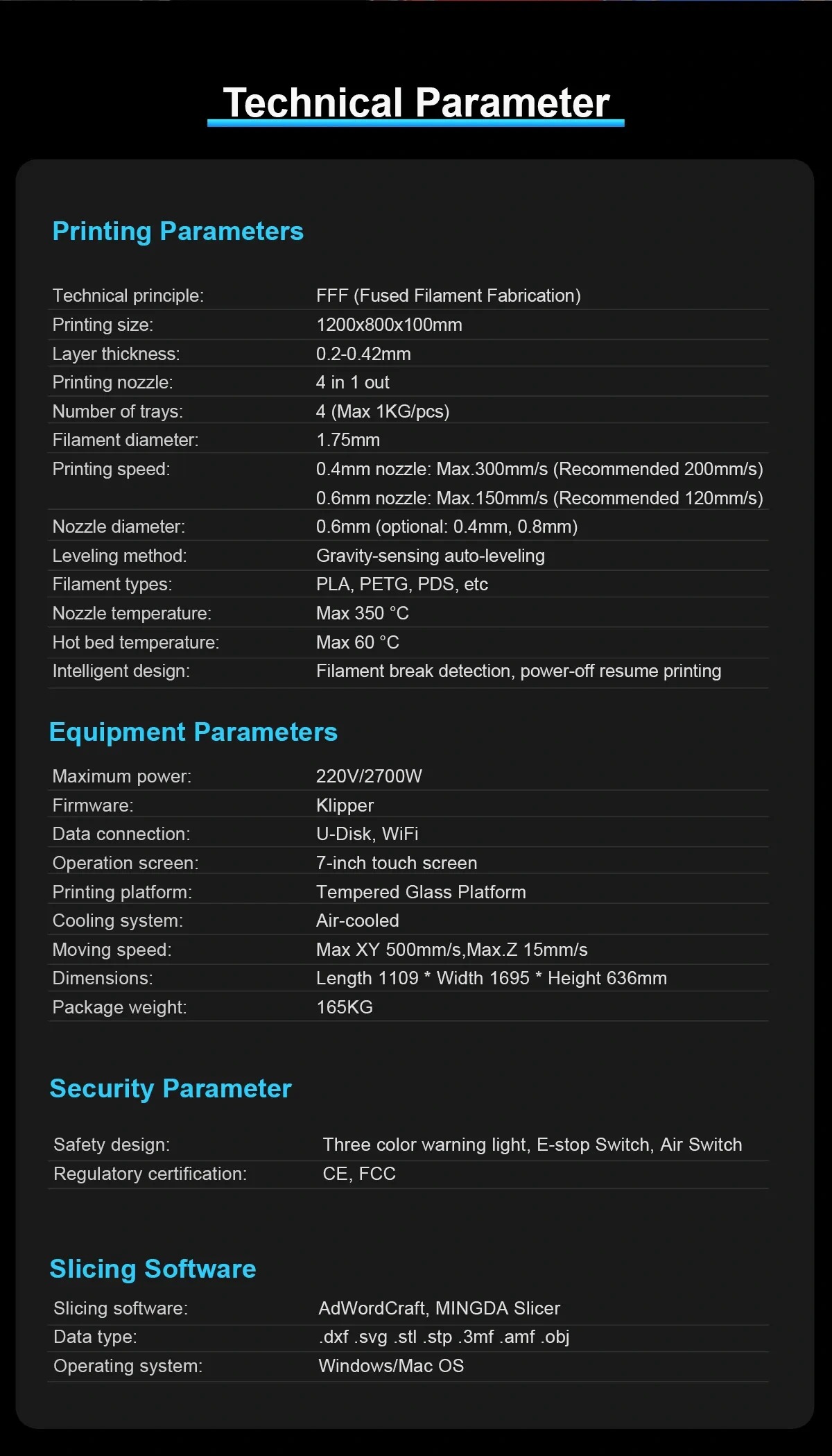 Mingda AD-F4: impresora 3D profesional para letras y cartelería con cambio automático de 4 colores, gran área de 1200×800×100 mm y alta velocidad con Klipper. Ideal para señalética y producción en serie. Auto-nivelación, cambio automático de color y reanudación de impresión ante cortes de energía.