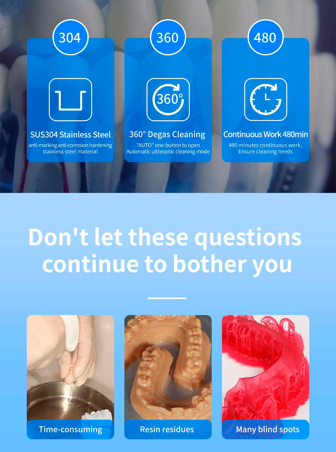 El CD-X3 cuenta con tecnología de limpieza desgasificadora de 360° y limpieza ultrasónica en modo AUTO para modelos dentales, logrando una cobertura completa sin causar daños. Limpia eficazmente los espacios y utiliza alcohol para una limpieza más profunda, eliminando de forma segura los residuos de resina. Este proceso optimiza la preparación del modelo para la polimerización secundaria, mejorando así la calidad general del servicio dental.