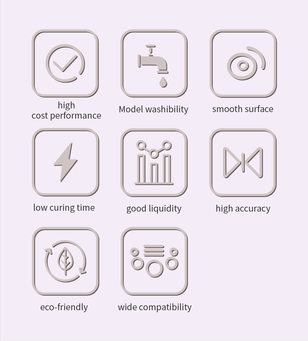 Lavabilidad, alto rendimiento en costos, superficie lisa, bajo tiempo de curado, buena liquidez, alta precisión, ecológico, amplia compatibilidad.