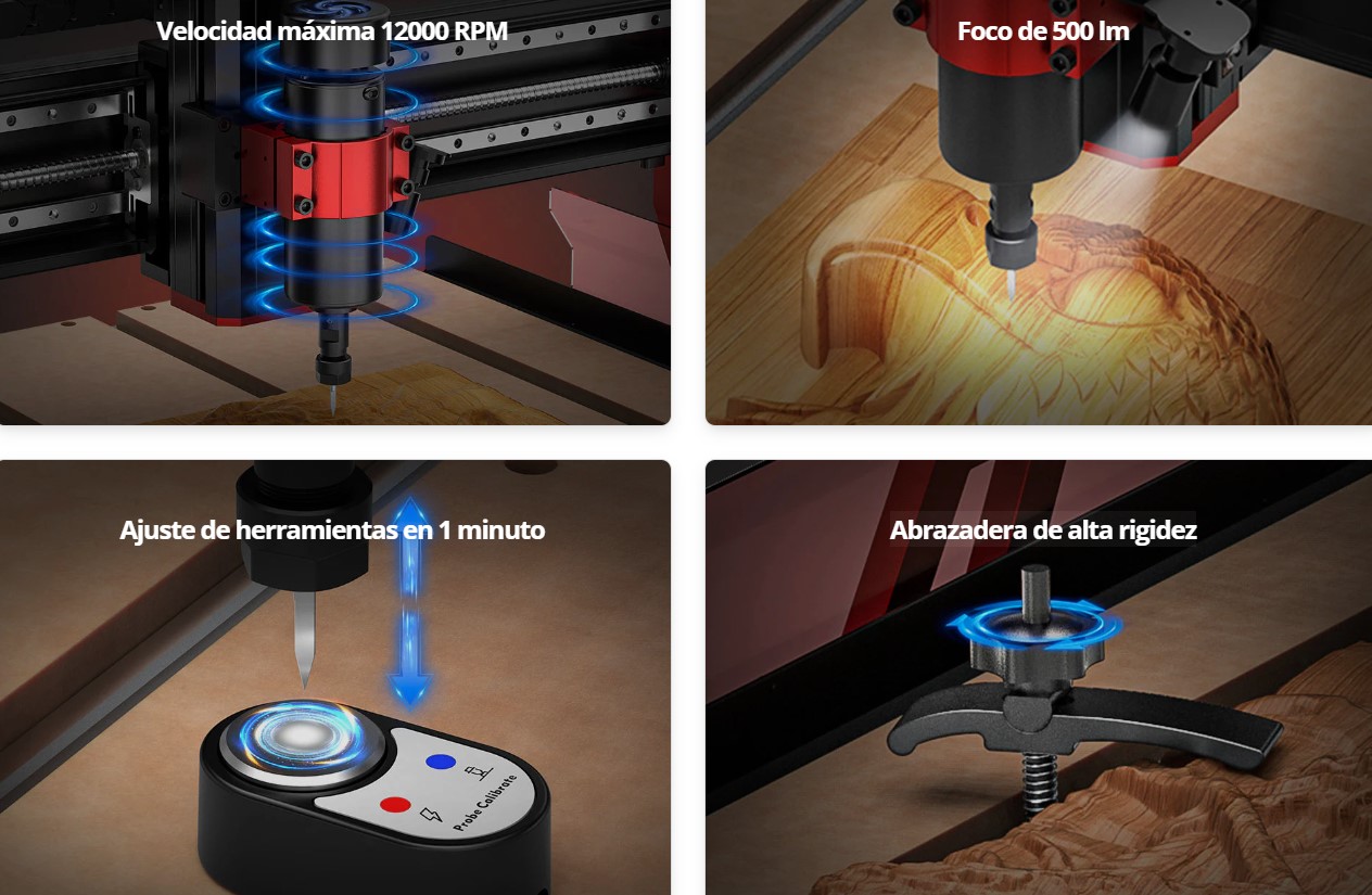 El husillo de 800 W alcanza una velocidad máxima de 30 000 RPM, lo que ofrece flexibilidad para satisfacer diferentes necesidades de procesamiento. Su rango de velocidad ajustable le permite manejar aplicaciones de trabajo ligero y pesado con eficiencia.