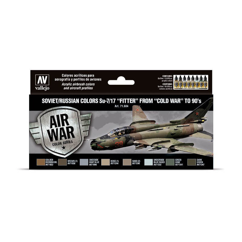 Estuche de colores Model Air desarrollado para pintar diferentes modelos del Sukhoi Su-7 “Fitter” y su modelo evolucionado o Su-17 de la Fuerza Aérea Soviética durante la “Guerra Fría”. Incluye perfiles de aviones, donde se indican los colores necesarios para pintar los esquemas de camuflaje y una descripción detallada de los mismos.