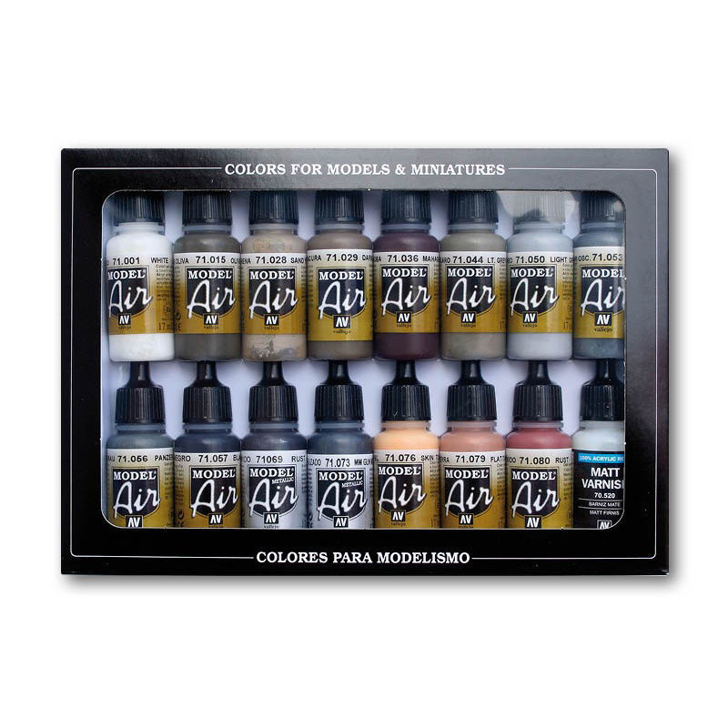 Estuche de 16 colores Model Air para pintar maquetas, miniaturas y dioramas. Contiene botellas de 17 ml./0.57 fl.oz. (con cuentagotas) y una carta de colores.