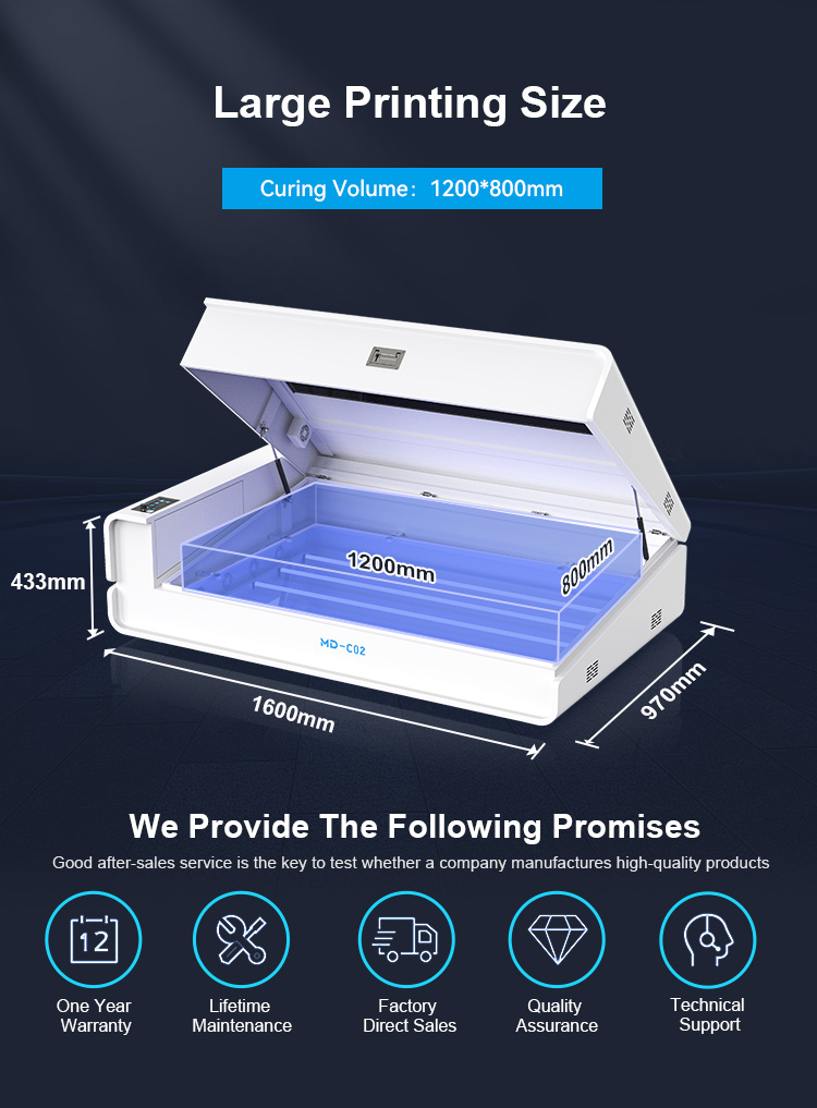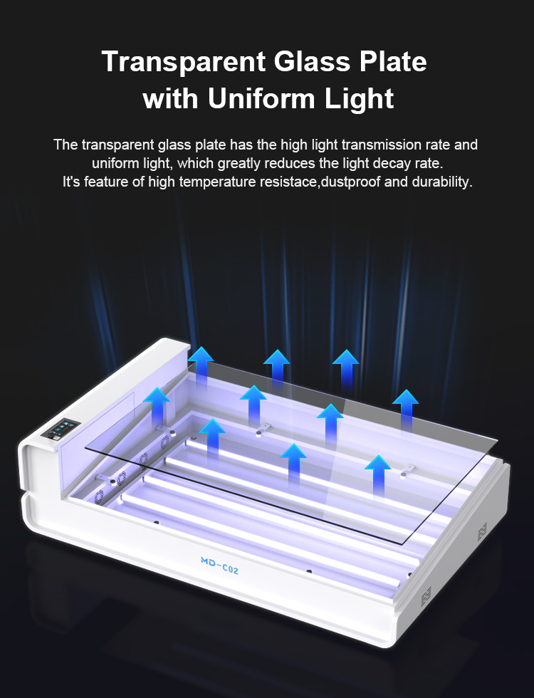 La MD-C02 utiliza una plataforma giratoria de 360° y LED UV estratégicamente ubicados para garantizar una exposición completa y uniforme desde todos los ángulos. Esto resulta en un curado consistente con mínimas sombras o zonas sin curar, esencial para impresiones de resina de calidad profesional.