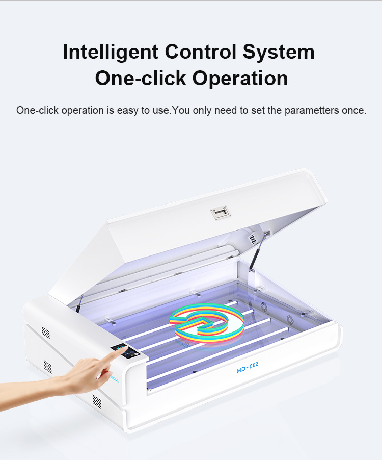 A pesar de su eficiencia de grado industrial, el MD-C02 presenta un tamaño compacto y un diseño elegante que se adapta fácilmente a cualquier espacio de trabajo, lo que lo hace perfecto para estudios hogareños, laboratorios profesionales o fabricación de lotes pequeños.