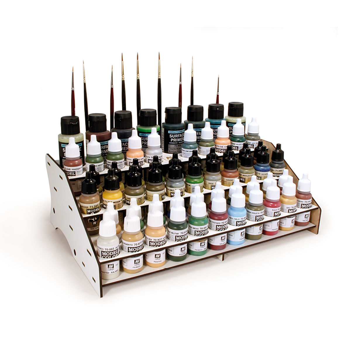 La solución para organizar los colores de Vallejo. El módulo frontal permite exponer 52 botellas de 17 ml/0.57 fl oz, junto con 8 botellas de 35 ml/1.18 fl oz o 60 ml/2.02 fl oz y 22 pinceles. De fácil montaje, no requiere pegamento.
