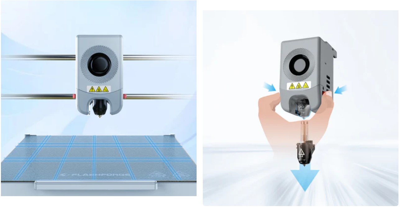 Las boquillas de liberación rápida AD5M permiten cambios rápidos y sin herramientas en solo 3 segundos, admitiendo múltiples modos de impresión para una experiencia fluida y eficiente.