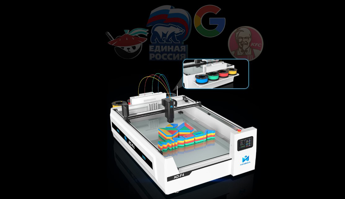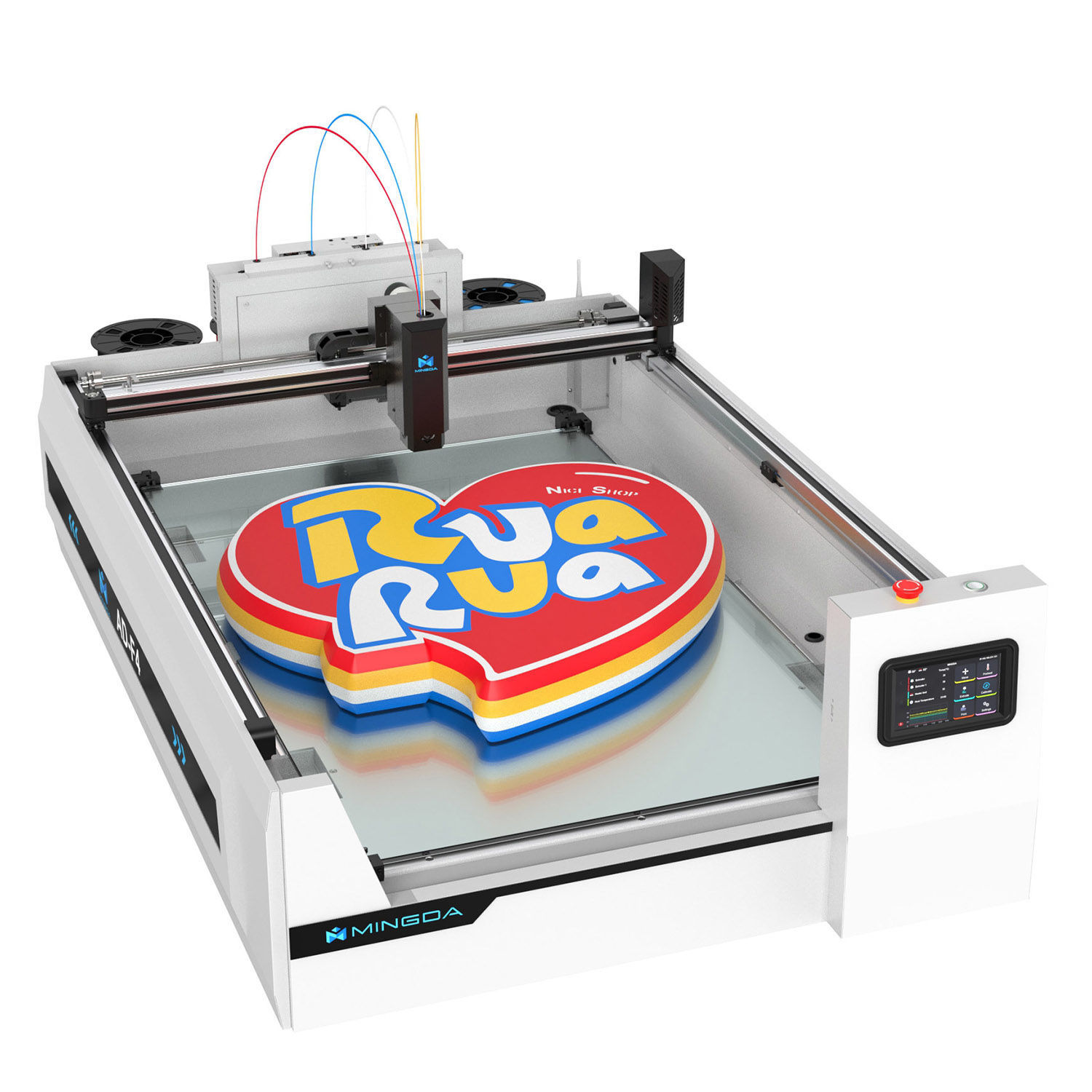 Mingda AD-F4: impresora 3D profesional para letras y cartelería con cambio automático de 4 colores, gran área de 1200×800×100 mm y alta velocidad con Klipper. Ideal para señalética y producción en serie. Auto-nivelación, cambio automático de color y reanudación de impresión ante cortes de energía.