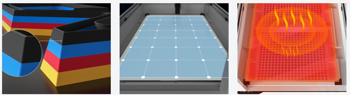 El sistema de autonivelación de tercera generación es más rápido y preciso, mejorando la adherencia de la primera capa, ahorrando tiempo en la nivelación y aumentando simultáneamente la tasa de éxito de las impresiones.