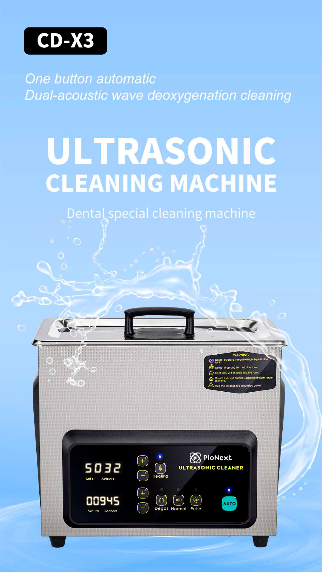 El limpiador ultrasónico profesional CD-X3 es una solución de vanguardia diseñada específicamente para cumplir con los altos estándares de limpieza dental. Diseñada con precisión, esta máquina de limpieza ultrasónica automática de un solo botón cuenta con un proceso de desoxigenación por ondas ultrasónicas que garantiza una limpieza impecable de todos sus instrumentos y modelos dentales.
