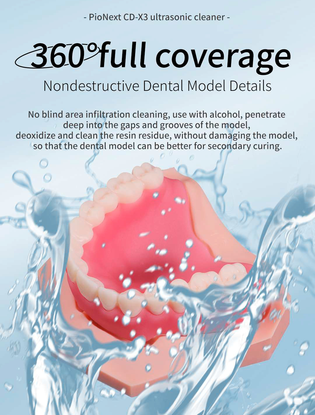 El CD-X3 cuenta con tecnología de limpieza desgasificadora de 360° y limpieza ultrasónica en modo AUTO para modelos dentales, logrando una cobertura completa sin causar daños. Limpia eficazmente los espacios y utiliza alcohol para una limpieza más profunda, eliminando de forma segura los residuos de resina. Este proceso optimiza la preparación del modelo para la polimerización secundaria, mejorando así la calidad general del servicio dental.