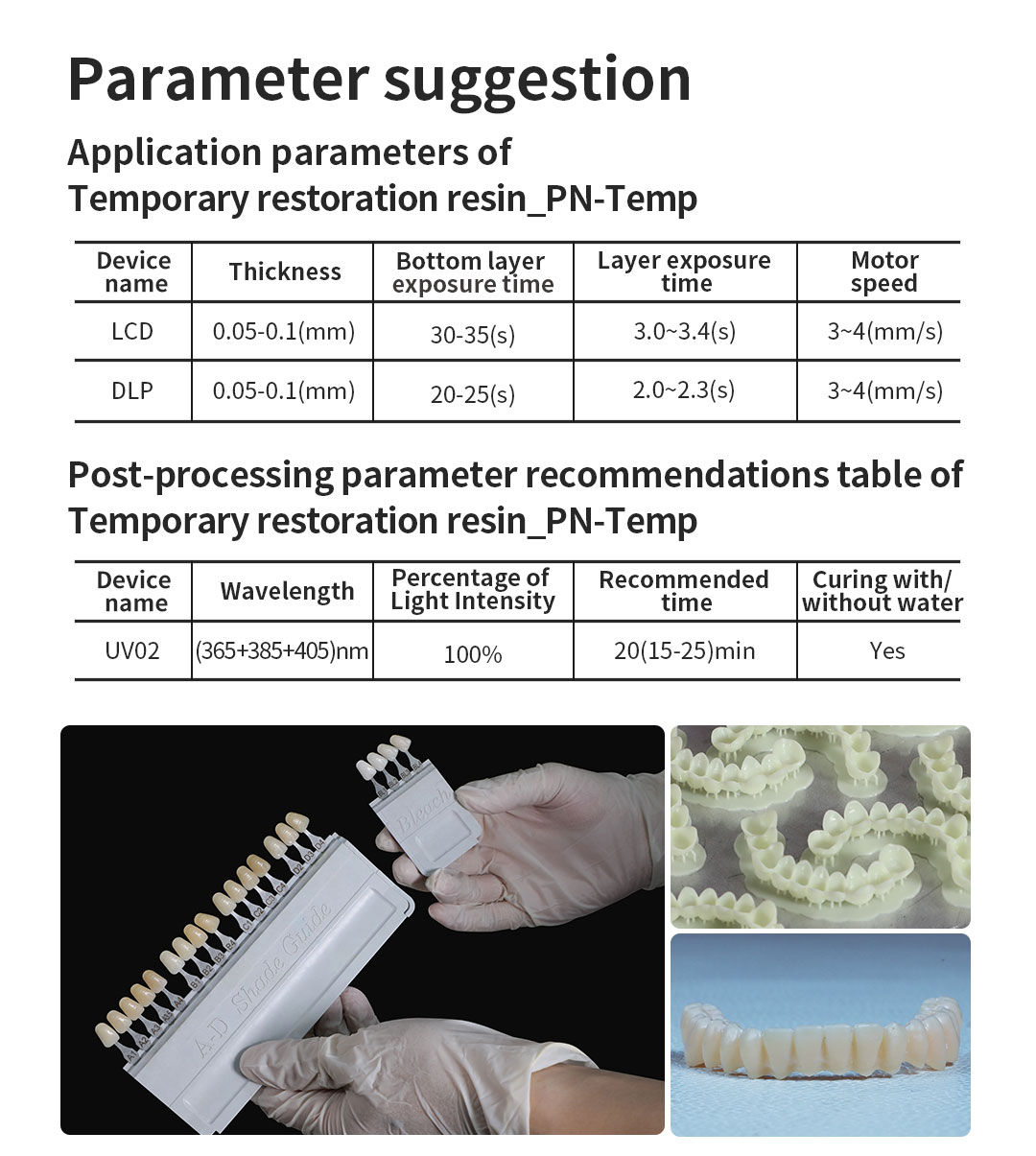 Aplicación: Coronas temporales/modelos invisibles, modelos de prueba en diversas aplicaciones dentales y médicas.