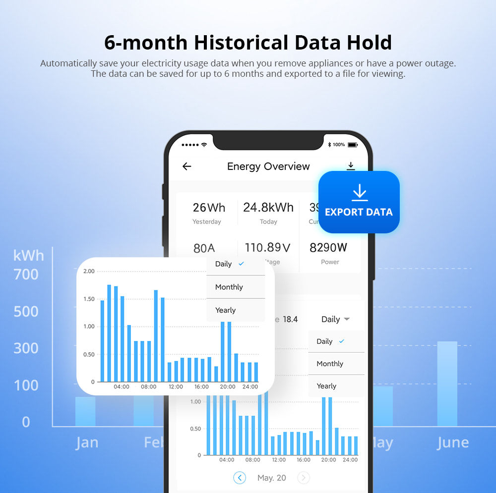 Cuenta con almacenamiento de datos por hasta 6 meses, exportables en formato Excel para un análisis detallado. Además, ofrece protección contra sobrecargas, apagando el sistema si se superan los umbrales configurados de potencia, voltaje o corriente.