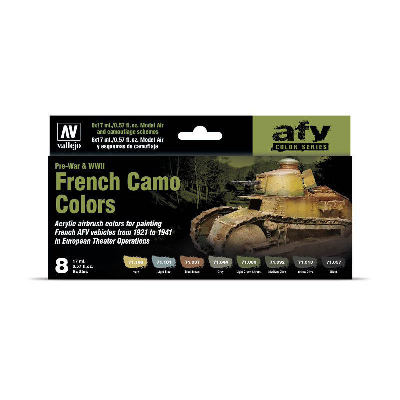 El set incluye 8 referencias de la gama Model Air en formato de 17 ml para pintar los esquemas de camuflaje de los vehículos de combate, camiones o piezas de artillería del ejército francés, operativos durante la Segunda Guerra Mundial.