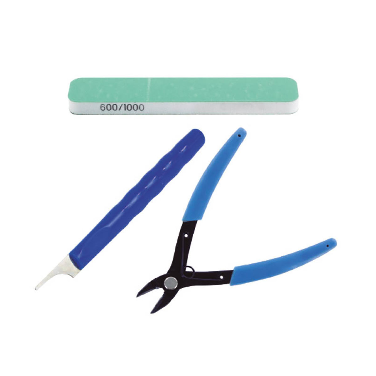 Set de herramientas básicas para modelismo en plástico y modelismo militar. Incluye lija flexible para trabajar en superficies planas y curvas, limpiador líneas de molde con filo de acero y empuñadura ergonómica y alicates de corte ideales para corte de precisión sobre plástico.